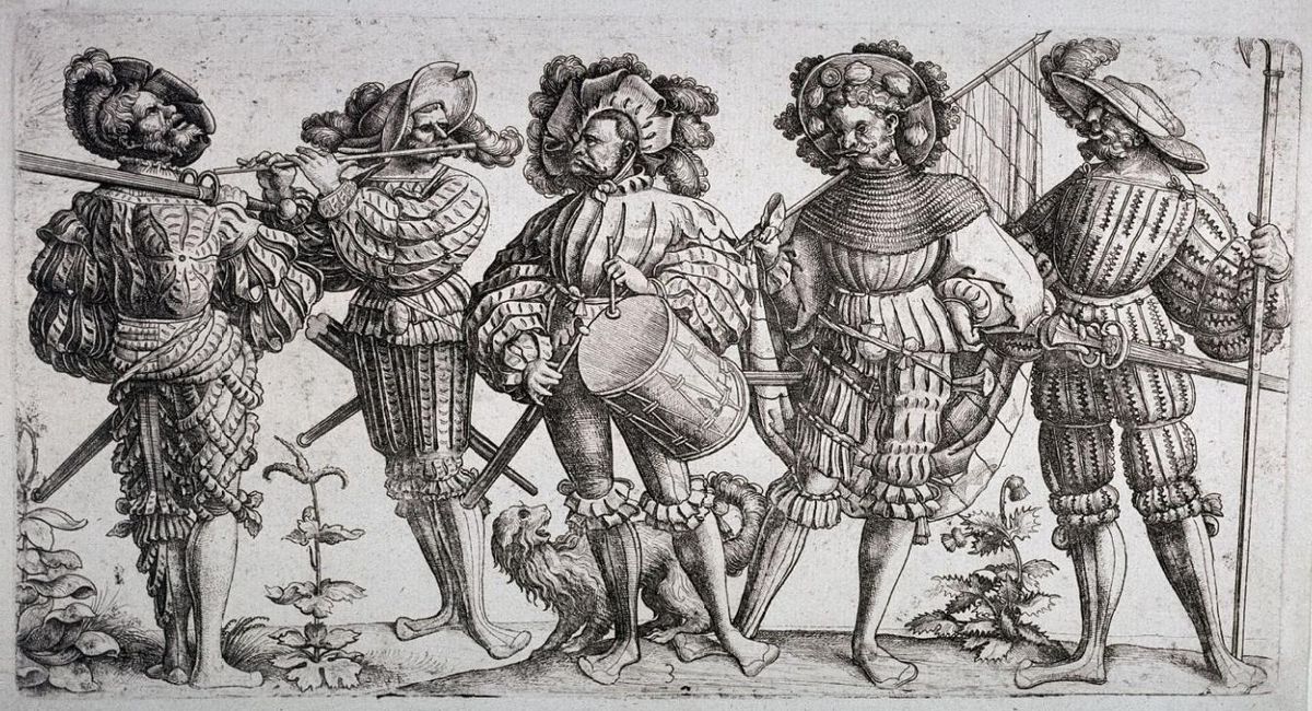 Ispod šešira nosili su otvorenu kacigu radi zaštite glave. Torzo su štitili raznovrsnim lakim oklopima, bogato kaneliranim pločastim poluoklopima ili kirasama. Preko vunene jakne nosili su kožni prsluk (njem. Wams). Kao obuću su imali tzv. cipele kravljih usta(njem. Kuhlmaulschuh), karakteristične po širokom prednjem dijelu cipele.