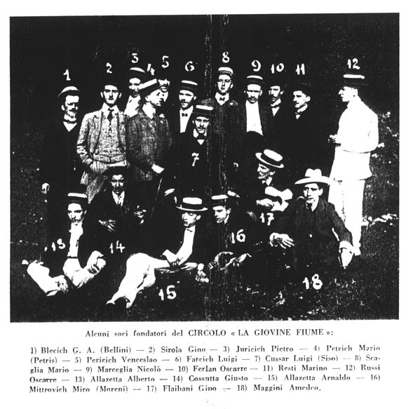 Moja prva asocijacija na ovakve slamnate šeširiće fotografija je članova udruge Giovine Fiume. Ova riječka iredentistička organizacija, svoju ulogu aktivno je ostvarivala neposredno nakon svršetka Prvog svjetskog rata. Popisivali su stanovnike mijenjajući im nacionalnost. Maltretirali su ljude po terasama koji se nisu htjeli ustajati na talijansku himnu. A među njihovim najdražim aktivnostima bilo je uništavanje natpisa hrvatskih tvrtki.